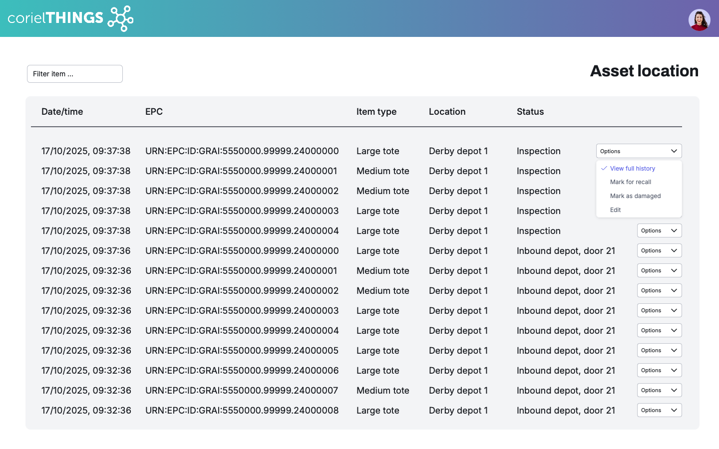 Using GS1 and EPC-based identifiers, corielTHINGS programs durable barcodes, QR codes and UHF RFID tags for every item. A unique digital link connects the physical asset to its cloud record. From that point you can: