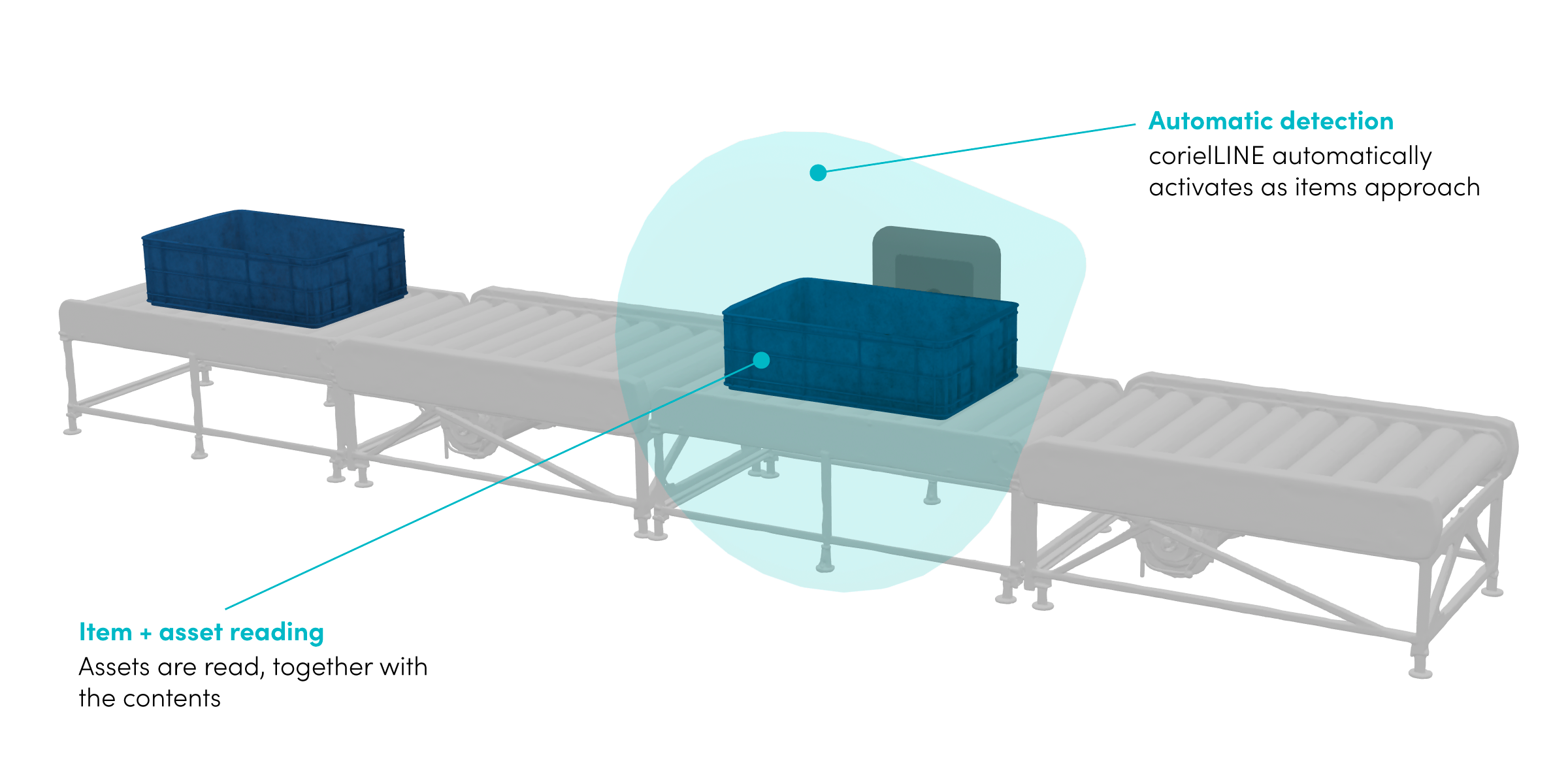Designed to work seamlessly on your existing conveyor and transit rigs, corielLINE is a high-performing line-side system capable of reliably and quickly reading any item (or items) as they pass down the system. Items can be read singularly, or in many instances the content of a container can be read, allowing sub-components or items to be reported without the need to remove them.