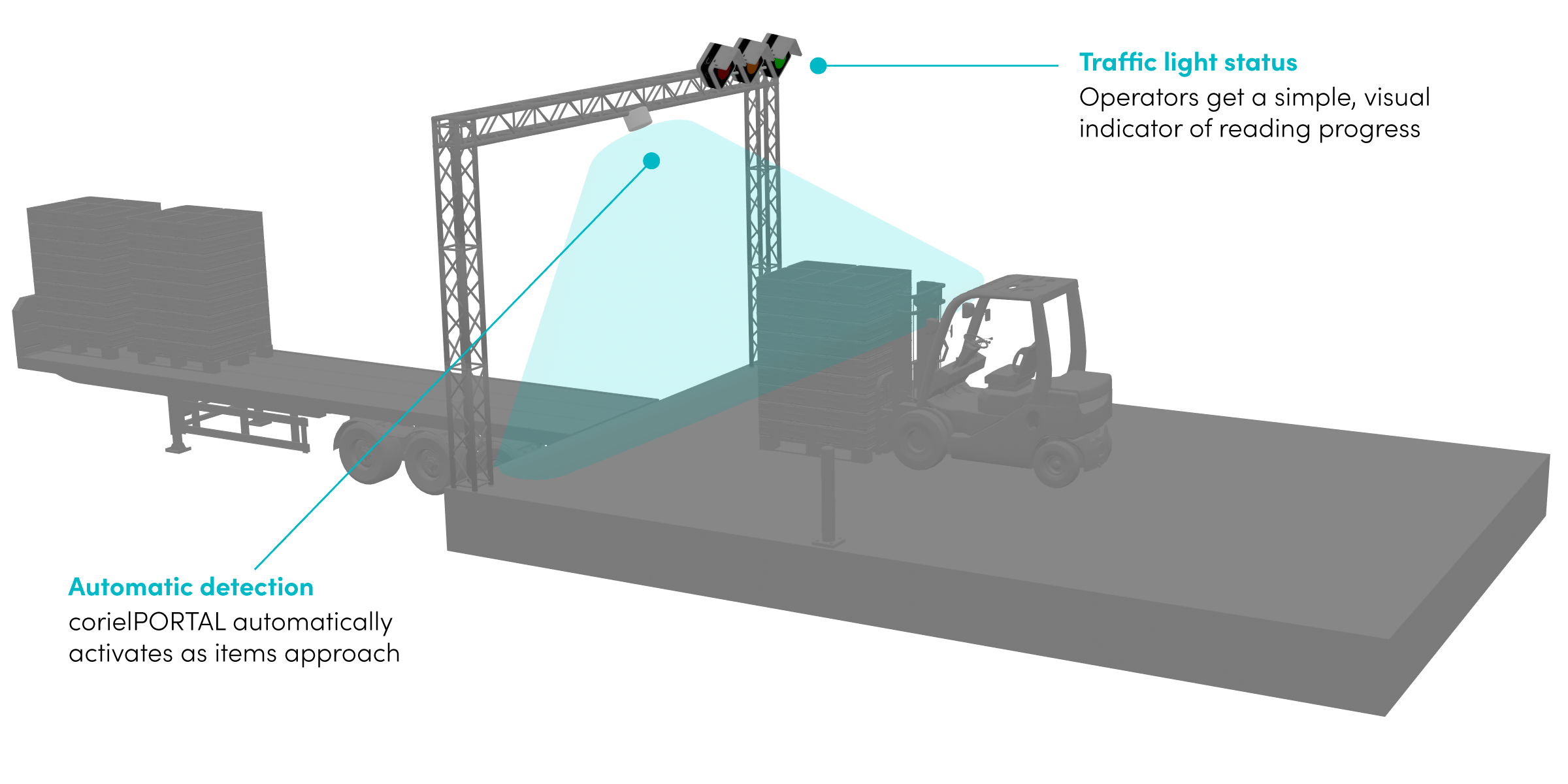 corielPORTAL is a zero-human-intervention system, meaning operators can continue their normal tasks of loading, unloading, and transporting palletised goods around your facility. Sophisticated sensors detect when a pallet is approaching, and all items on the pallet (and the pallet itself) are read, together with the direction of travel. Data collected is immediately relayed via corielTHINGS to your backend system, confirming a receipt, despatch of movement of goods.